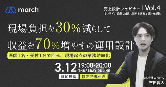 LINEを活用した集患と継続収益まで自動化することで、医療機関の “成果に責任を持つ” オンライン診療・集患オペレーションシステム「march」を展開する株式会社Wrusty(本社:東京都渋谷区、代表取締役:上田遼)は、全国の開業医・開業予定医の皆様を対象に、無料オンラインセミナー「現場負担を30%減らして収益を70%増やす運用設計~医師1名・受付1名で回る現場起点の業務効率化~」を2026年3月12日に開催いたします。本セミナーでは、医師1名・受付1名体制でも成果に繋げるオンライン診療の動線設計と、なぜ「march」を活用している医療機関は1年間で9倍という収益に繋げることができているかを、再現性の高い設計という観点から解説します。現場負担を30%減らして収益を70%増やす運用設計