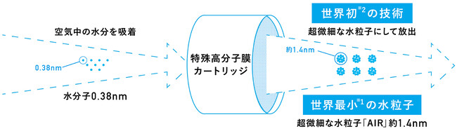 空気中の水分を超微細な水粒子に変換する世界初の技術※2で生み出される世界最小※1の約1.4ナノメートルの超微細水粒子AIR(アイル)。肌を潤す保湿効果や、皮膚に塗布した美容成分を肌の角質層まで浸透させる導入効果が期待できます。「AIR(アイル)」とは、AQUA(水)/INOVATIVE(革新的な)/RUDIMENT(原理)の頭文字をとった造語です。