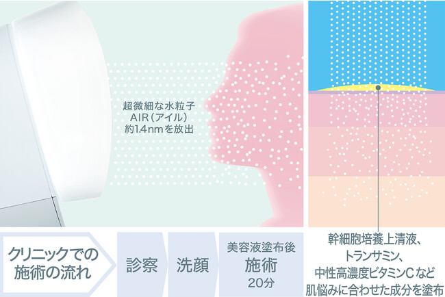 空気中の水分子を特殊なフィルターで世界最小※1の約1.4nm(ナノメートル)の超微細水粒子に変換して放出するという世界初の技術※2を搭載した画期的な機器で、目には見えない超微細な水粒子AIR(アイル)が肌の角質層に水分を拡散・保持し、塗布した薬剤や美容成分の導入をサポートすることで「保湿と導入のWの効果」を実現しています。