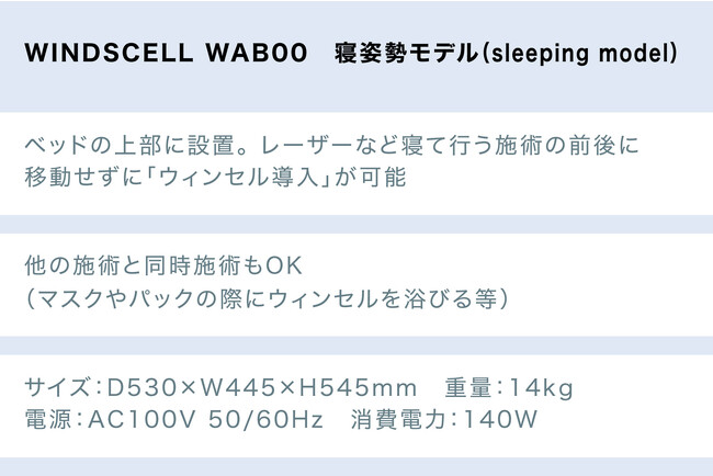 顔全体が包まれくつろいだ施術が可能 ヘアケアへの応用も新しいsleeping modelでは、レーザーやフォトフェイシャルの前後やベッドで点滴をする際に、とあらゆるタイミングで患者さまに移動いただかずにスムーズに「ウィンセル導入」を加えることができ、マスクやパックをして行う「ウィンセルパック」といった新しい施術メニューも可能です。