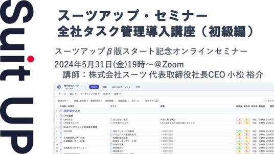 この度、株式会社スーツ(所在地:東京都千代田区、代表取締役社長CEO:小松 裕介)は、2024年5月31日(金)19時から、当社代表の小松が講師を務めるスーツアップ・セミナー「全社タスク管理導入講座(初級編)」を無料開催します。