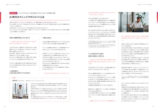 <AIスペシャリストへのインタビューを収録>AIのスペシャリストであると同時に、企業のナレッジマネジメントに実際に取り組んできた北内 啓氏(株式会社ユーザベース)へのインタビューも掲載。