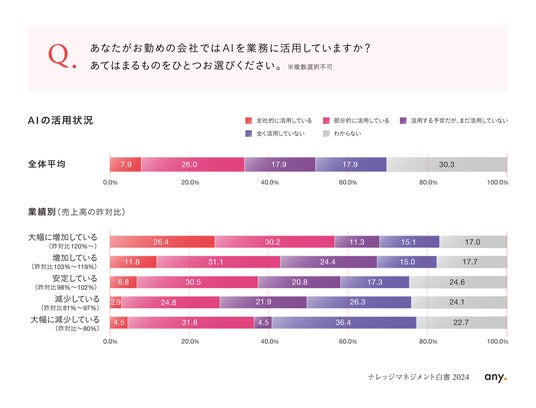 今回の調査でも、業績が向上している企業は、AI活用とナレッジマネジメントへの取り組みを積極的に進めていることが明らかになりました。