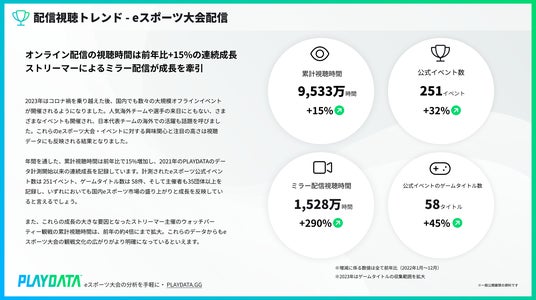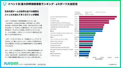株式会社プレイブレーン(本社所在地:東京都品川区 以下、プレイブレーン)は、eスポーツ配信データ分析サービス「PLAYDATA」通じて計測されたデータを基に、2023年1月1日から12月31日の期間における国内eスポーツ大会配信の視聴トレンドを詳細に分析した年間トレンドレポートの販売を開始しました。