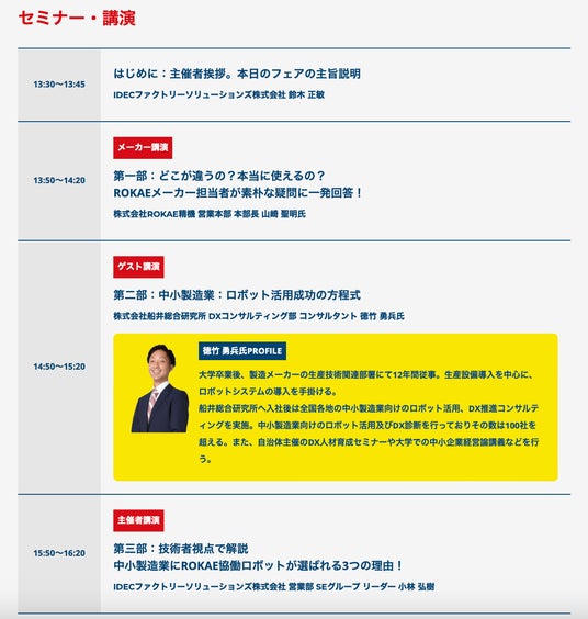 本イベントでは、セミナーのゲスト講演として株式会社船井総合研究所 DXコンサルティング部の徳竹氏をお招きし、中小製造業が協働ロボット導入で成果を上げるコツをわかりやすく解説頂く他、当社が販売代理店を務めるROKAE協働ロボットを活用したアプリケーション実演、使いやすさを追求したスターターキットのご紹介など、盛りだくさんの内容でお送りします。