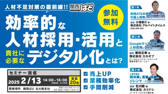 株式会社関西ぱど(本社:大阪市西区靭本町1-10-24 三共本町ビル5F 代表取締役 富岡 紀幸)は、採用に関する課題を抱える企業様に向けて、2025年2月13日(木)に「採用課題解決セミナー」を開催いたします。