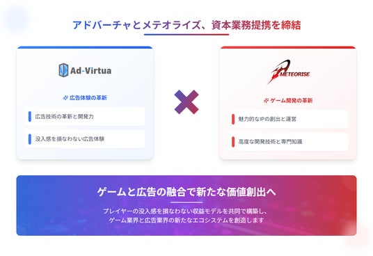 アドバーチャ株式会社(本社:東京都北区、代表取締役CEO:水野 征太朗、以下「アドバーチャ」という)と株式会社メテオライズ(本社:東京都千代田区、代表取締役社長:渡邉 幸二、以下「メテオライズ」という)は、このたび資本業務提携契約を締結いたしました。メテオライズはアドバーチャへ出資を行い、両社は今後、ゲーム開発の早期段階から広告体験を設計し、プレイヤーの没入感を損なわない収益モデルを共同で検討してまいります。