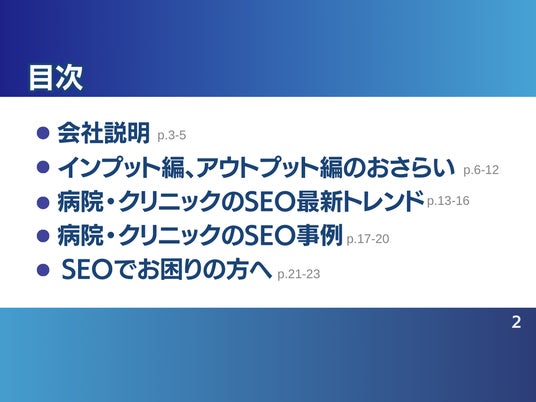 本レポートでは病院・クリニックのSEO最新トレンドについて、今後どのようなSEO対策が必要になるかを詳細に解説しています。