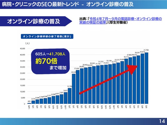 令和2年4月の時点では605人でしたが、令和4年9月には41708人と約70倍に増加しています。オンライン診療は医療機関が立地しているエリアに限定せず、より広範なエリアからの顧客獲得が期待できます。修了者数の増加に伴い、オンライン診療を導入する医療機関が増え、
