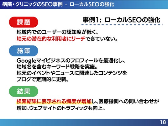 当社のSEOコンサルタントが、サイトのSEO課題とそれぞれの課題で行うべき施策の事例について解説をしています。本レポートでは、以下の3つの事例を通して病院・クリニックのSEO対策について理解することが可能です。