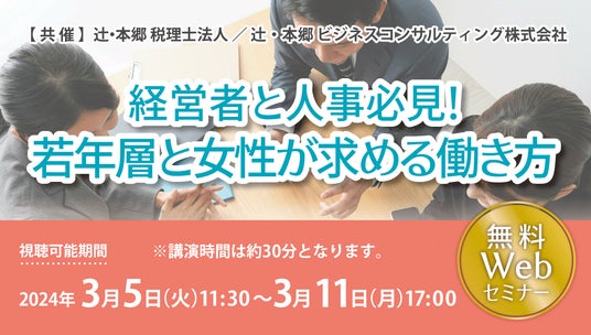 辻・本郷 税理士法人(本社:東京都新宿区、理事長:徳田孝司)と辻・本郷 ビジネスコンサルティング株式会社(本社:東京都千代田区、代表取締役社長:金子寿一)は、共催で2024年3月5日より「経営者と人事必見! 若年層と女性が求める働き方」セミナーを開催いたします。人材不足の中、「苦労して採用した若手が定着しない」、「女性が退職してしまう」というお悩みを抱えている企業は少なくありません。本セミナーでは、若年層と女性の職場定着をテーマに、現場の実態と離職原因の把握、改善方法をわかりやすく解説いたします。令和6年度の税制改正でも、賃上げ促進税制の人的投資に対する要件として、女性活躍支援・子育て支援をした企業の上乗せが創設されました。この機会に、若年層や女性の働きやすい職場環境の整備に取り組んでみませんか。