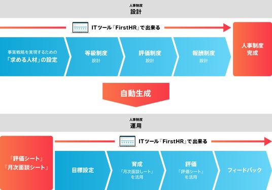2. 設計・運用一体型ITツールの特長を視覚的にご紹介Web上で人事制度(等級制度・評価制度・報酬制度)を設計でき、設計と同時に評価シートや月次面談シートが自動生成される仕組みをわかりやすく図で紹介しています。