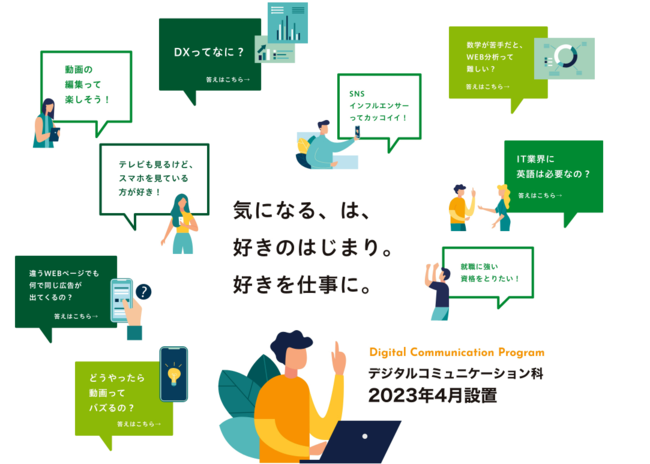 神田外語グループ(東京都千代田区/理事長 佐野元泰)の専門学校、神田外語学院(東京都千代田区/学院長 糟谷幸徳)は、2023年4月に「デジタルコミュニケーション(DC)科」を新設します。新学科のコンセプトは「気になる、は、好きのはじまり。好きを仕事に」。新学科では、WEBやSNSの“裏側”をしっかりと理解し、どの業界でも必要とされるデジタルスキル(データ分析、映像表現技法、WEB・SNSマーケティングなど)と、考え方(メディアリテラシー、デザイン、ダイバーシティなど)を英語とともに幅広く学びます。身につけたデジタルスキルを駆使し、物事を多角的に捉え、分析・企画・提案ができるDX人材を育成することを目的としています。