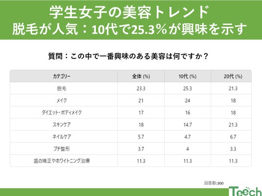 10代~20代の学生はどんな美容に興味があるのでしょうか?現代の若者たちは、美容に対する意識が非常に高く、日々の生活の中でさまざまな美容ケアを取り入れています。特に、学生の間では、どのような美容法が人気を集めているのか興味深いテーマです。そこで、美容に関するアンケートを10代から20代の学生女子300名を対象に行い、その結果を分析しました。その結果、最も関心を持っている美容ケアは「脱毛」であることが明らかになりました。