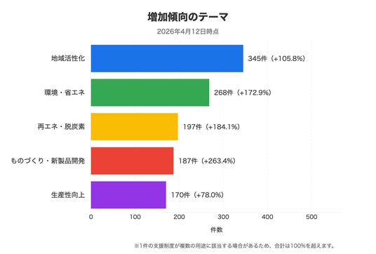 この3か月で最も増加数が大きかったのは地域活性化(+345件)で、環境・省エネ(+268件)と再エネ・脱炭素(+197件)がそれに続きます。再エネ・脱炭素は後半に約2.8倍へと急増しており、太陽光や省エネ機器の設置を対象とする制度が含まれています。地域活性化テーマには地方の脱炭素・エネルギー自給に関連する制度も含まれており、両テーマを組み合わせた条件で候補が広がる場合があります。