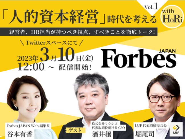 グローバル経済メディア『Forbes JAPAN Web』編集長 谷本有香氏と、ハイクラス層の人材紹介事業を展開するLUF株式会社(代表取締役社長 吉本明加)取締役会長 堀尾司による、人的資本経営をテーマとしたビジネスリーダーセッション企画をTwitterスペース音声コンテンツにて実施いたします。各回、注目企業の経営者、またはCHROの皆さまをゲストに迎える本企画。第一弾のゲストは株式会社リクシス副社長 酒井 穣氏を予定しております。※LUF株式会社:株式会社All Personal(本社:東京都港区、代表取締役CEO:堀尾司)の子会社