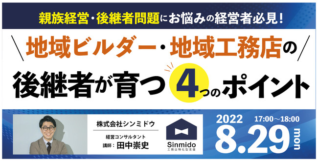 株式会社シンミドウ(本社:埼玉県さいたま市、代表取締役:笹田知弘)は、2022年8月29日(月)に、全国の後継者問題にお悩みの工務店・住宅ビルダーを対象に「地域ビルダー・地域工務店の後継者が育つ4つのポイント」と題して、無料ウェビナーを開催します。