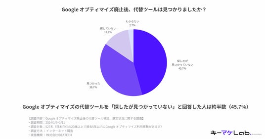 Googleオプティマイズとは、Googleが無料で提供していたWebサイトテストツールで、2023年9月30日をもって廃止されています。今回の調査では、利用経験者の45.7%が「代替ツールを探したが見つかっていない」ということが明らかになりました。