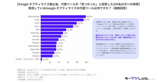 株式会社 キーワードマーケティング株式会社キーワードマーケティング(本社:東京都中央区、代表取締役:滝井 秀典、以下「キーワードマーケティング」)が展開するメディア「キーマケLab(読み:キーマケラボ)」は、過去5年以内にGoogleオプティマイズの利用経験がある日本在住の20歳以上の方527名を対象に「Googleオプティマイズ廃止後の代替ツール検討および選定状況に関する調査」を実施いたしました。