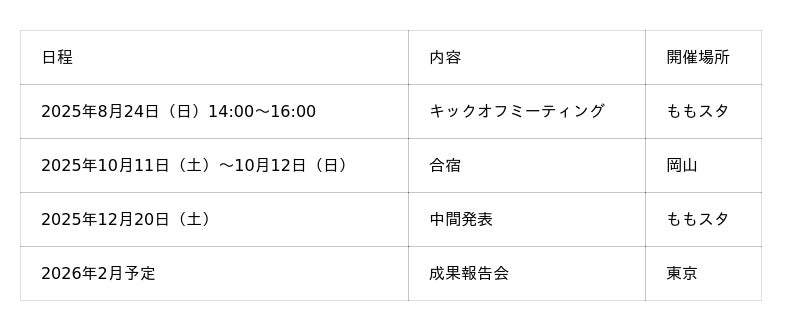 最大150万円の開発支援金を支給 実施期間全体を通じて、1チームあたり最大150万円の支援金を提供。参加者はこの資金を活用して、プロトタイプ開発やユーザー検証などに取り組むことができます。