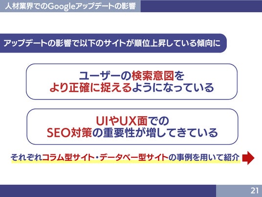 具体的な事例をもとにアップデートの影響を詳細に解説しています。アップデートの特徴や人材業界でのGoogleアップデートの対策などのSEO情報にも注目です。