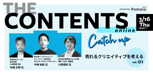 コンテンツ力を活かしてより良いコミュニケーション施策を提供するPomalo株式会社(本社:東京都港区、代表取締役社長:高橋崇之、以下Pomalo https://www.pomalo.jp/)は、マーケティング業界で活躍する実践者のトップランナーたちを招き、最新のクリエイティブやコンテンツ事例について、本気で語りあい、知見を共有するオンライントークイベント「THE CONTENTS~Catch up~」を開催いたします。