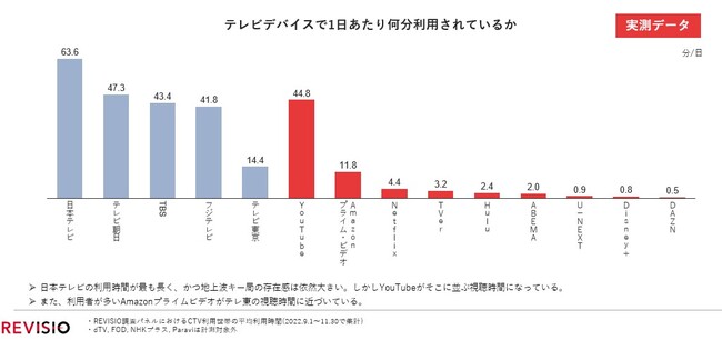 下のグラフを見ると、地上波の利用時間は動画サービスと比べても長いことがわかります。動画サービスの中でもYouTubeは、地上波と同等かそれ以上に見られていることがわかりました。