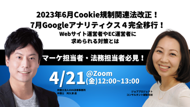 ハタラクをつくる、楽にする、楽しむソリューションを提供するジョブプロジェクト株式会社(本社:東京都新宿区、代表取締役:鈴木 貴大 https://job-project.com/ 以下、ジョブプロ)は、この度、GVA法律事務所の阿久津透弁護士とともに、「2023年6月Cookie規制関連法改正! 7月Googleアナリティクス4完全移行! Webサイト運営者やEC運営者に求められる対策とは」と題し、オンラインセミナーを2023年4月21日(金)12:00~開催いたします。