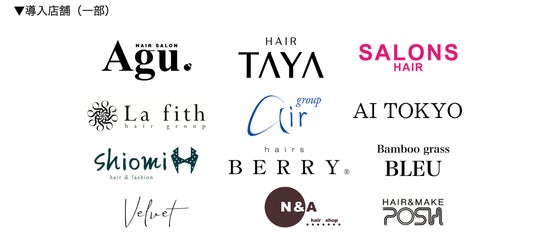 導入店舗はAgu. hair salon、TAYAグループ、airなど大手美容サロンから、全国men'sサロン受賞のアイトーキョー(AI TOKYO)まで様々で、導入店舗数は美容サロンサイネージにおいて業界最大級(※1)の規模となっています。