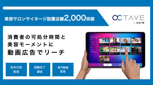デジタルOOHアドネットワーク事業およびCMS開発・運用事業を行う、株式会社MADS(東京都渋谷区 代表取締役:穴原 誠一郎、以下MADS)は全国の美容サロン向けに「従来のサロン体験の枠を超えていく」をコンセプトに、インタラクティブに動画コンテンツに接触できるタブレット型サイネージサービス「OCTAVE(オクターヴ)、以下OCTAVE」の導入店舗が2,000店舗(2024/10/1時点)を超えたことをお知らせします。