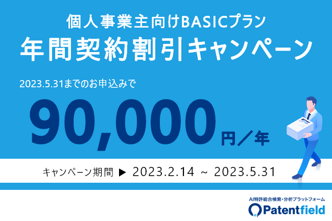 Patentfield株式会社(本社:京都市中京区、共同CEO:村上直也、石津孝祐)は、個人事業主向けBASICプランの年間契約割引キャンペーンを開始します。