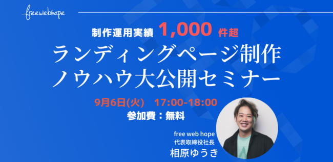 株式会社free web hope(本社:東京都千代田区、代表取締役:相原ゆうき)は、無料のオンラインセミナー「制作運用実績1,000件超 ランディングページ制作ノウハウ大公開」を9月6日(火)に開催いたします。(申し込み先: