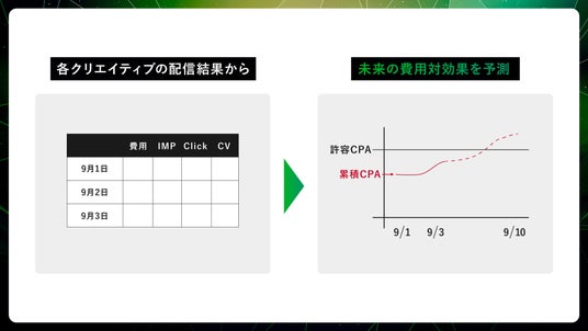 クリエイティブごとに、配信開始後の費用、表示回数、クリック数、CV数などのデータを弊社独自のモデルで分析-