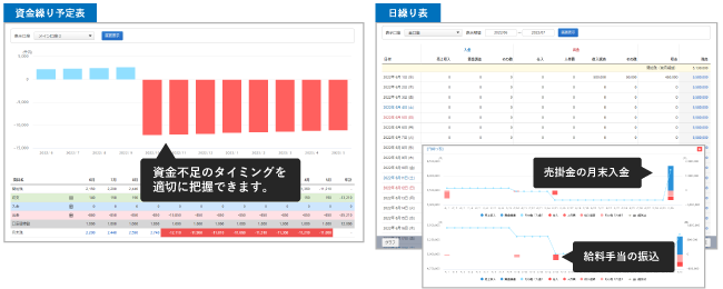 「日繰り表」を自動作成します。資金需要・資金不足のタイミングを適切に把握することができるため、