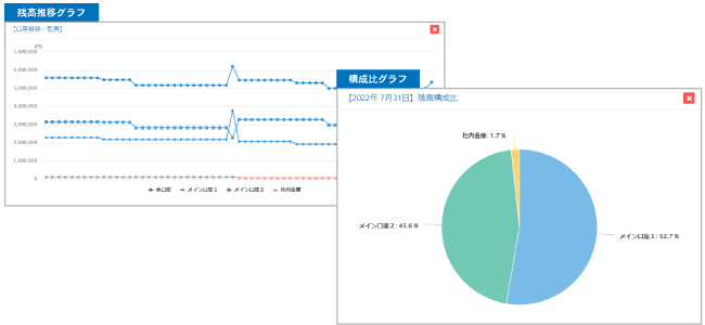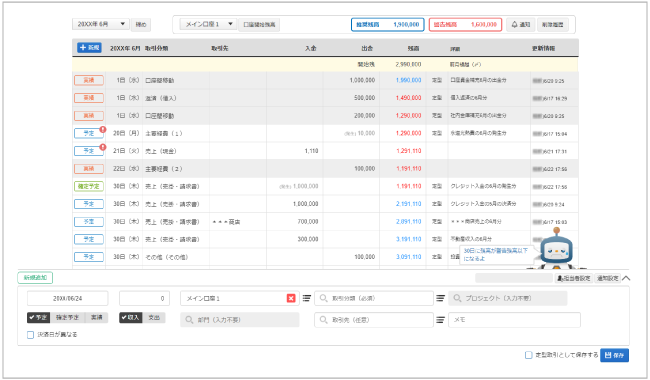 「預金口座ごと」に管理することができます。口座の残高は一覧で閲覧でき、資金不足のタイミングを事前に把握できるため、口座間の資金移動の準備を前もって行うことができます。また、現金残高管理も自由に行うことができ、拠点ごとの
