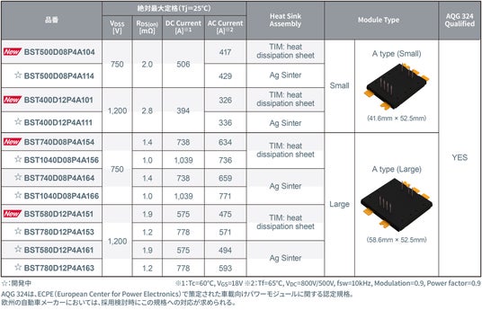 ローム株式会社(本社:京都市)は、300kWまでのxEV(電動車)用トラクションインバータ(*1)に対応可能な2in1(*2)仕様のSiCモールドタイプモジュール「TRCDRIVE(ティーアールシードライブ) pack(パック)(TM)」の製品として4品番(750V 2品番:BSTxxxD08P4A1x4、1,200V 2品番:BSTxxxD12P4A1x1)を開発しました。TRCDRIVE pack(TM)は、高い電力密度や独自の端子配置といった特長を備えており、トラクションインバータに要求される小型化、高効率化、工数削減といった主要な課題の解決に貢献します。
