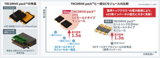 https://www.rohm.co.jp/news-detail?news-title=2024-06-11_news_trcdrive-pack&defaultGroupId=falseTRCDRIVE pack(TM)は、トラクションインバータ駆動向けに開発したSiCモールドタイプモジュールに対する商標であり、放熱面積を最大化するようなローム独自の構造によりコンパクトなパッケージを実現。さらに、新製品は低オン抵抗の第4世代SiC MOSFETを搭載しているため、SiCモールドタイプモジュールの一般品と比べて1.5倍となる業界トップクラスの電力密度を達成しており、xEV用インバータの小型化に大きく貢献します。