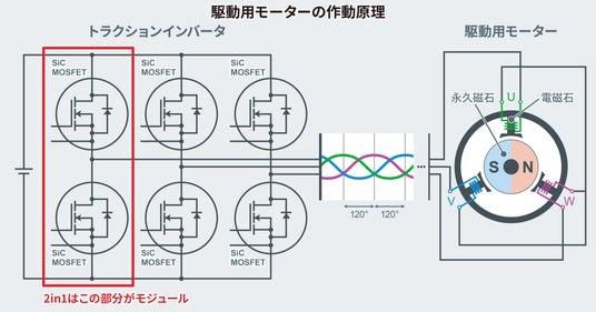 直流を3相交流に変換するためには、スイッチングを行うために1相あたりハイサイドとローサイドのMOSFETが1つずつ必要となる。この2つのMOSFETを1モジュールにしたものが2in1と呼ばれる構成である。