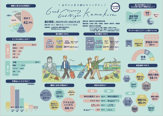 株式会社Koeeru(本社:神奈川県鎌倉市、代表取締役:長野 草児)は、公益社団法人鎌倉市観光協会(本社:神奈川県鎌倉市、会長:中村悟)との連携のもと、2024年度に鎌倉市内に宿泊した国内および訪日観光客を対象とした行動・意識調査の年間レポートを取りまとめ、インフォグラフィック形式にて公開いたしました。