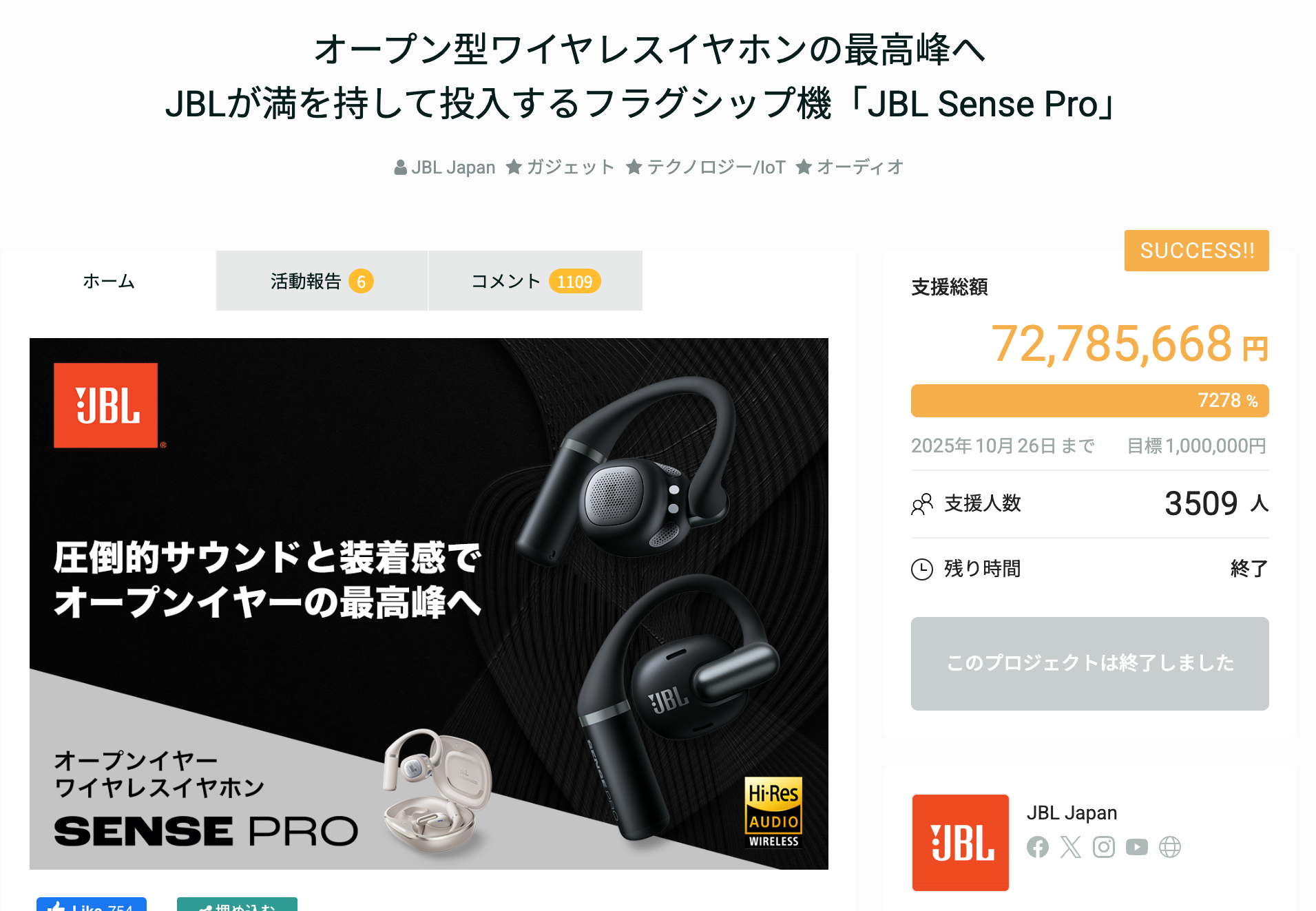 プロジェクトを詳しく見る第2位【72,785,668円達成】オープン型ワイヤレスイヤホンの最高峰へ JBLが満を持して投入するフラグシップ機「JBL Sense Pro」