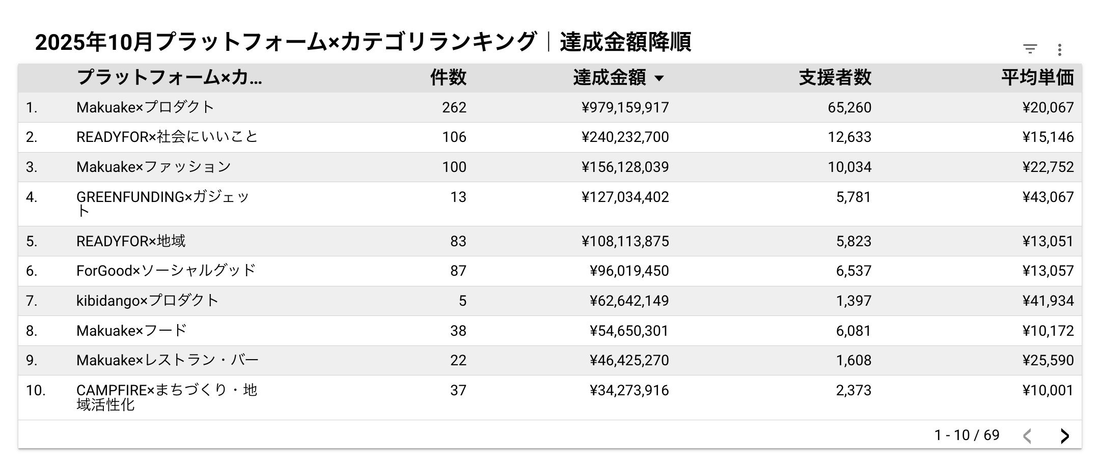 【カテゴリランキング】◼︎2025年10月達成金額ランキングプラットフォームとカテゴリを掛け合わせた分析では、以下のカテゴリが資金を集めました。