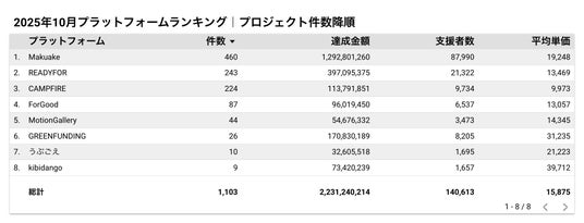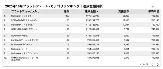 株式会社cracoでは、クラウドファンディング市場の透明化と発展への寄与を目的に、毎月国内主要プラットフォームのプロジェクトデータを独自に収集・分析しています。本レポートは、2025年10月1日から10月31日までの期間に終了したプロジェクトを対象に、資金調達額や支援者数などの主要指標をランキング形式でまとめたものです。