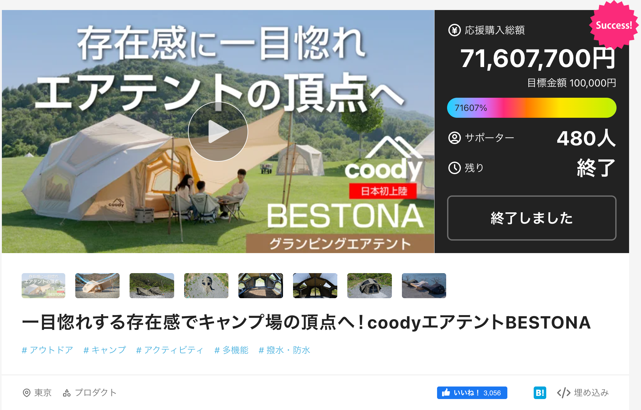 プロジェクトを詳しく見る第3位【71,607,700円達成】一目惚れする存在感でキャンプ場の頂点へ!coodyエアテントBESTONA