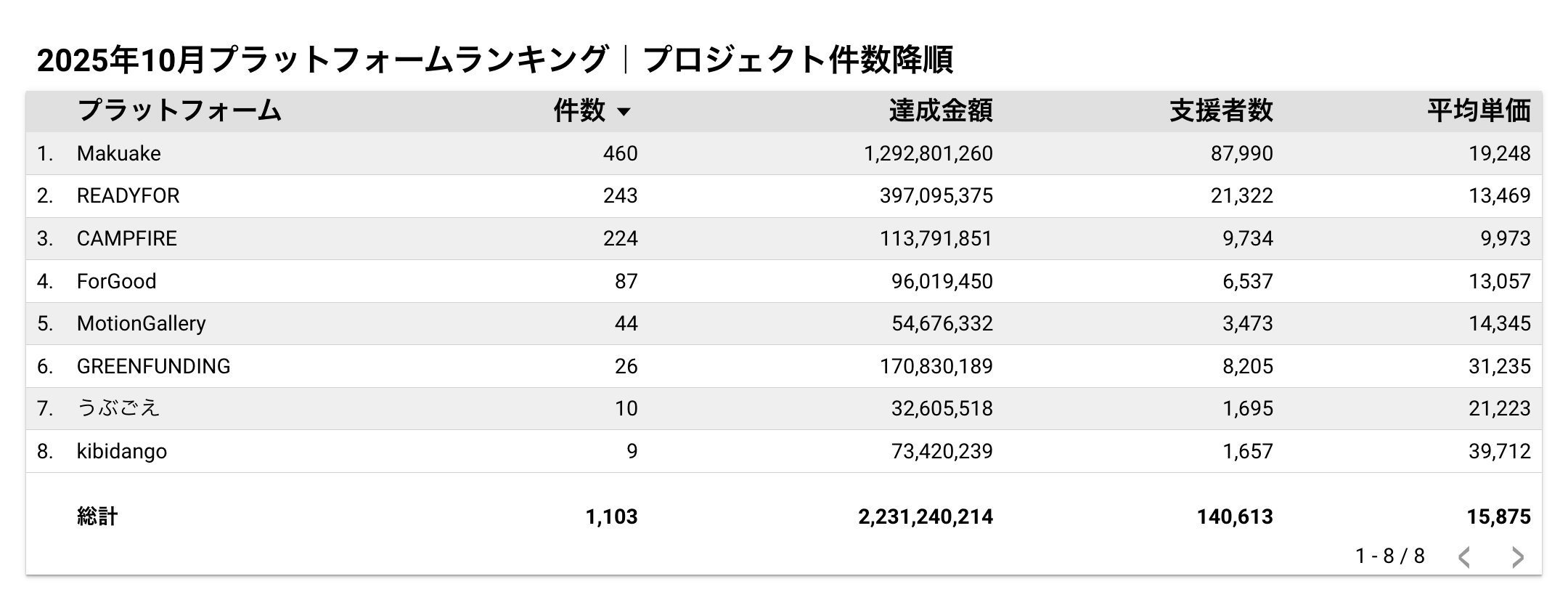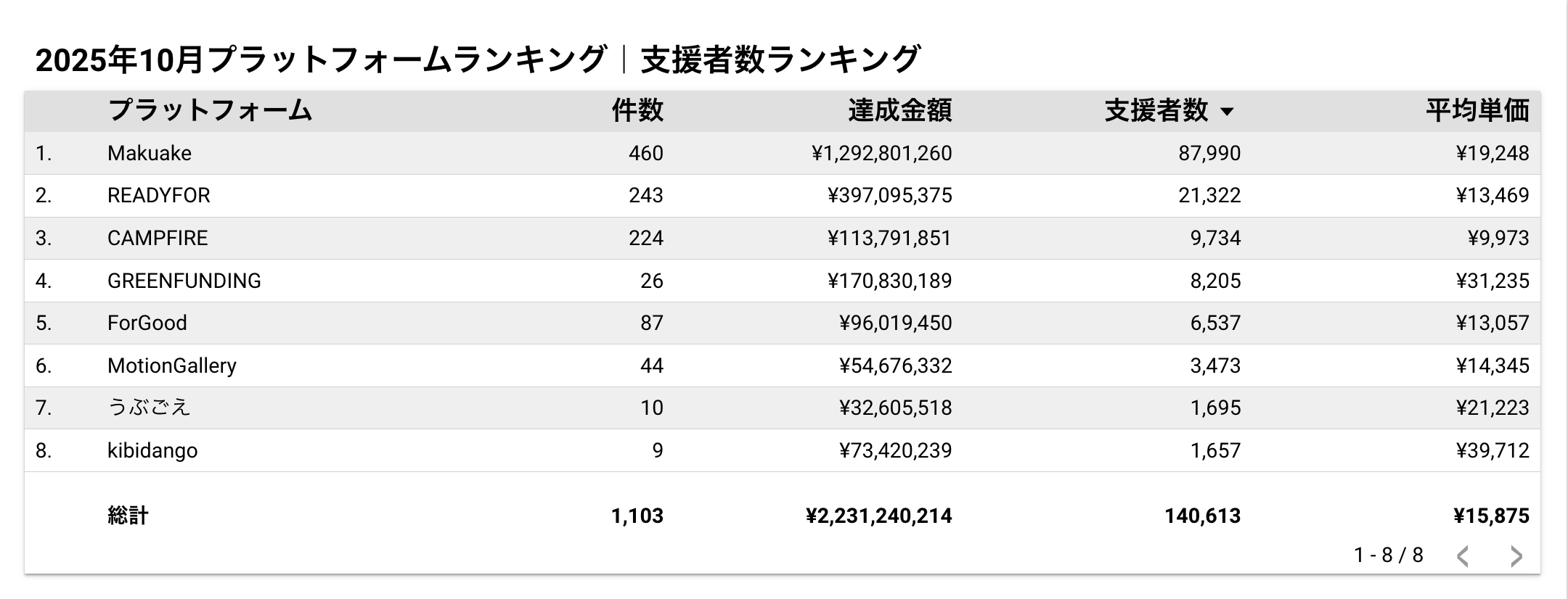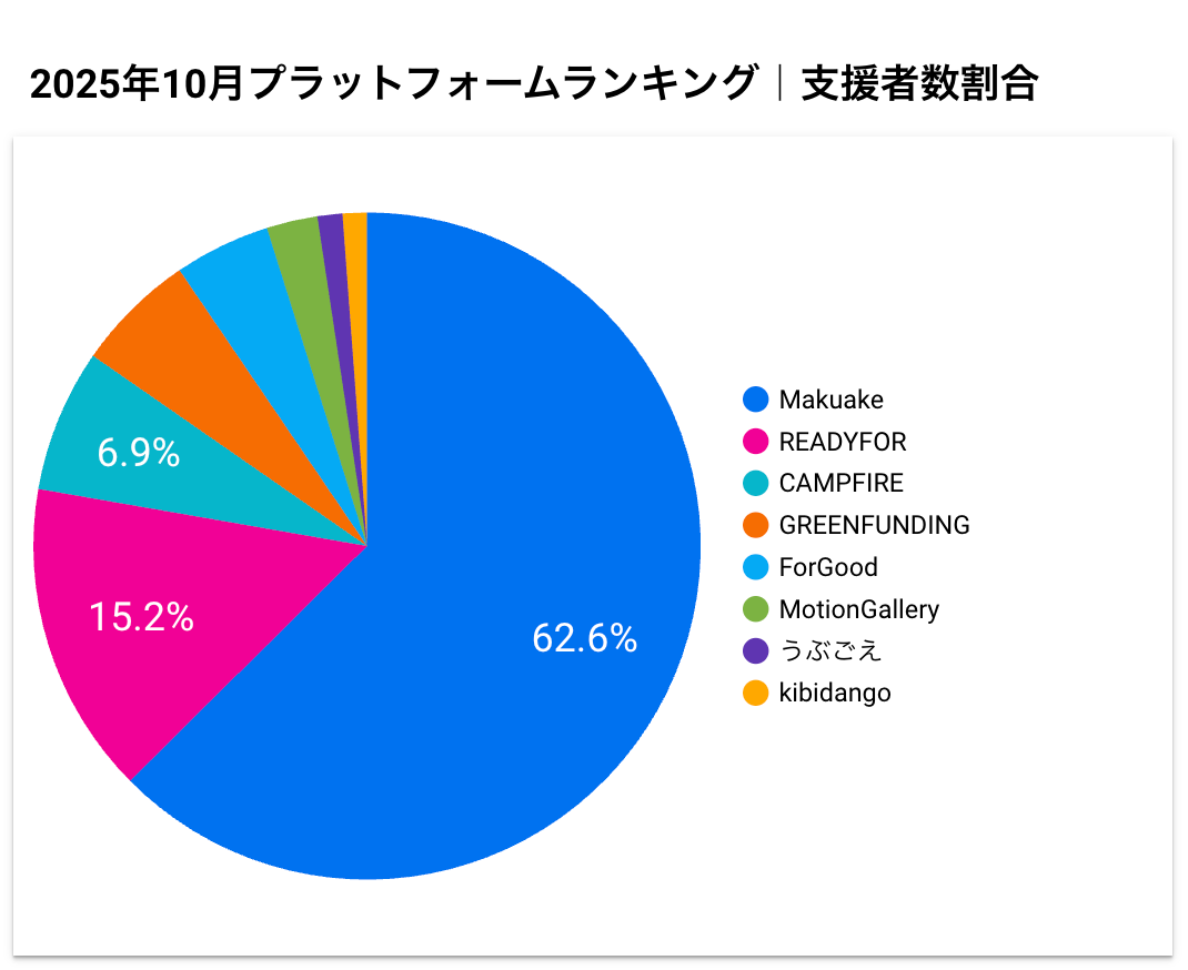 ◼︎2025年10月達成金額ランキング2025年10月の支援金額におけるプラットフォーム別の順位は以下の通りです。