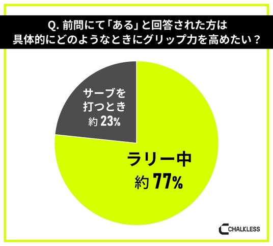 卓球経験者の中でグリップ力を高めたいと感じるシーンとして、「ラリー中」と回答した人が約77%、「サーブを打つとき」と回答した人が約23%いました。