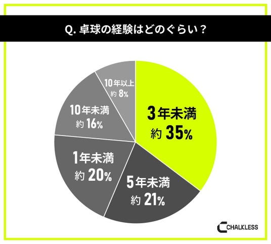 今回は全体として30~40代、女性の回答者が多かったです。また、経験年数は3年未満が一番多く、1年未満~10年以上まで幅広い卓球経験年数の方から回答をいただきました。