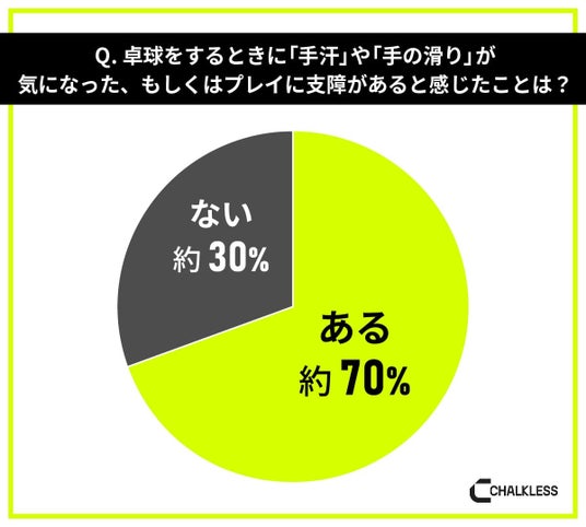 卓球の最中に手汗や滑りが気になった人は約70%と高い割合で手汗や滑りに関する悩みや課題感を持つ人がいることがわかりました。