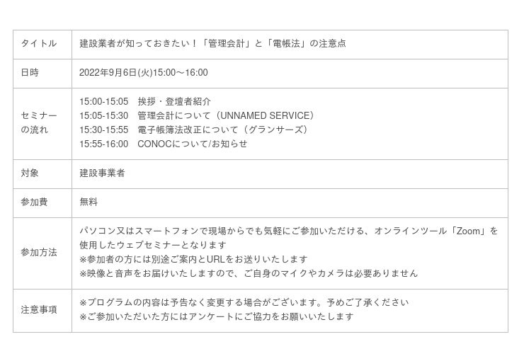株式会社CONOC(本社:東京都渋谷区、代表取締役:山口一、以下CONOC)は、2022年9月6日(火)に無料オンラインセミナー「建設業者が知っておきたい!管理会計と電帳法の注意点」を開催いたします。税理士法人2社をゲストに迎え、経営の基礎となる「管理会計」と「電子帳簿保存法」改正のポイントをレクチャーいただきます。