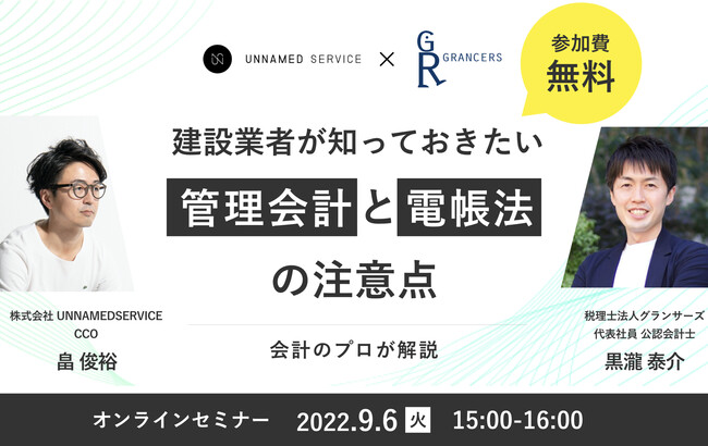 本セミナーでは、税理士法人UNNAMEDSERVICEの畠 俊裕と、税理士法人グランサーズの黒瀧 泰介から、経営計画や業務改善、原価の把握や管理といった経営判断に活用するために役立てられる「管理会計」の基本と、昨今話題の「電子帳簿法改正について」のポイントを解説させていただきます。