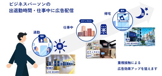 LIVE BOARD Networkに接続している主要なOOHスクリーンと、独自に保有するメディアの中から、VIFTが設置されている建物周辺に位置するメディアを厳選し、効果的に広告を配信する特別プランです。